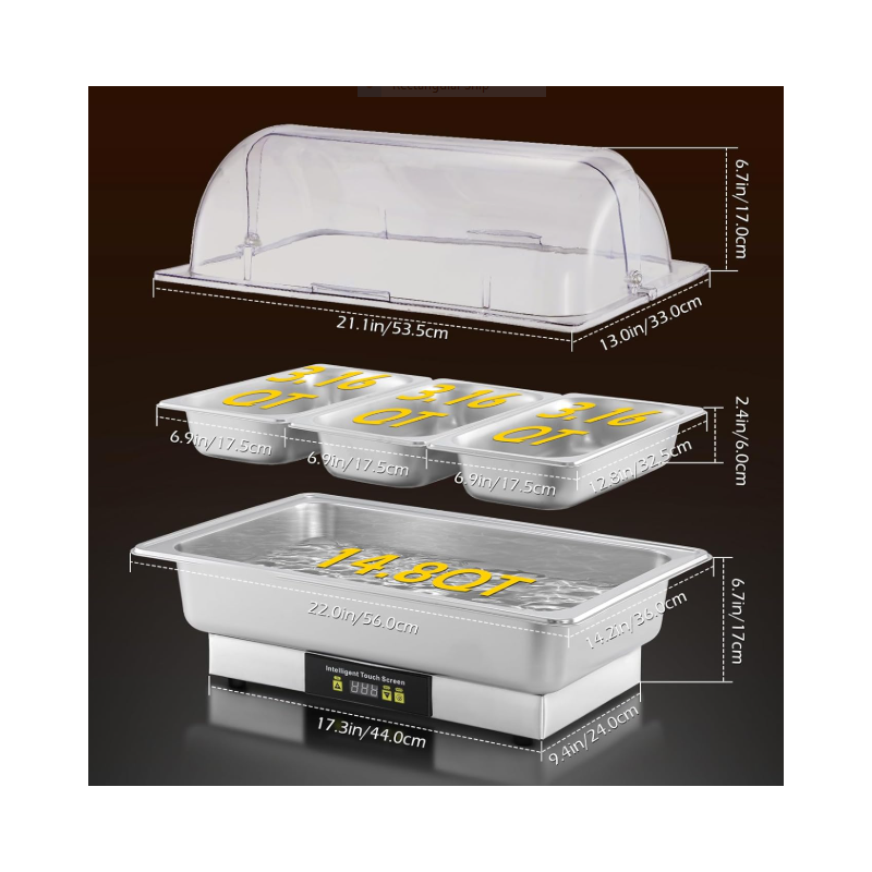 Cuisinière de buffet en acier inoxydable équipée de 3 plateaux chauffants et d’un réglage tactile pour maintenir efficacement vos plats au chaud jusqu’à 100 °C. Idéale pour hôtels, restaurants et buffets grâce à son isolation thermique et sa structure durable.