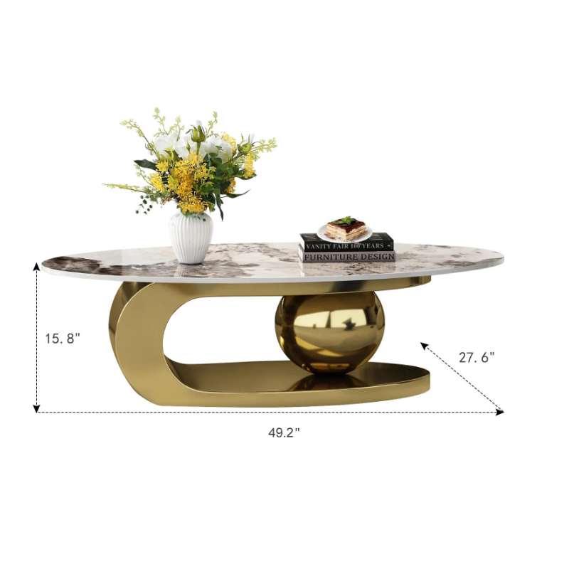 Table basse de luxe au design moderne, dotée d’un plateau ovale en pierre frittée imitation ardoise et d’un piètement en métal robuste. Élégante, durable et facile à entretenir, elle s’intègre parfaitement dans les espaces contemporains.